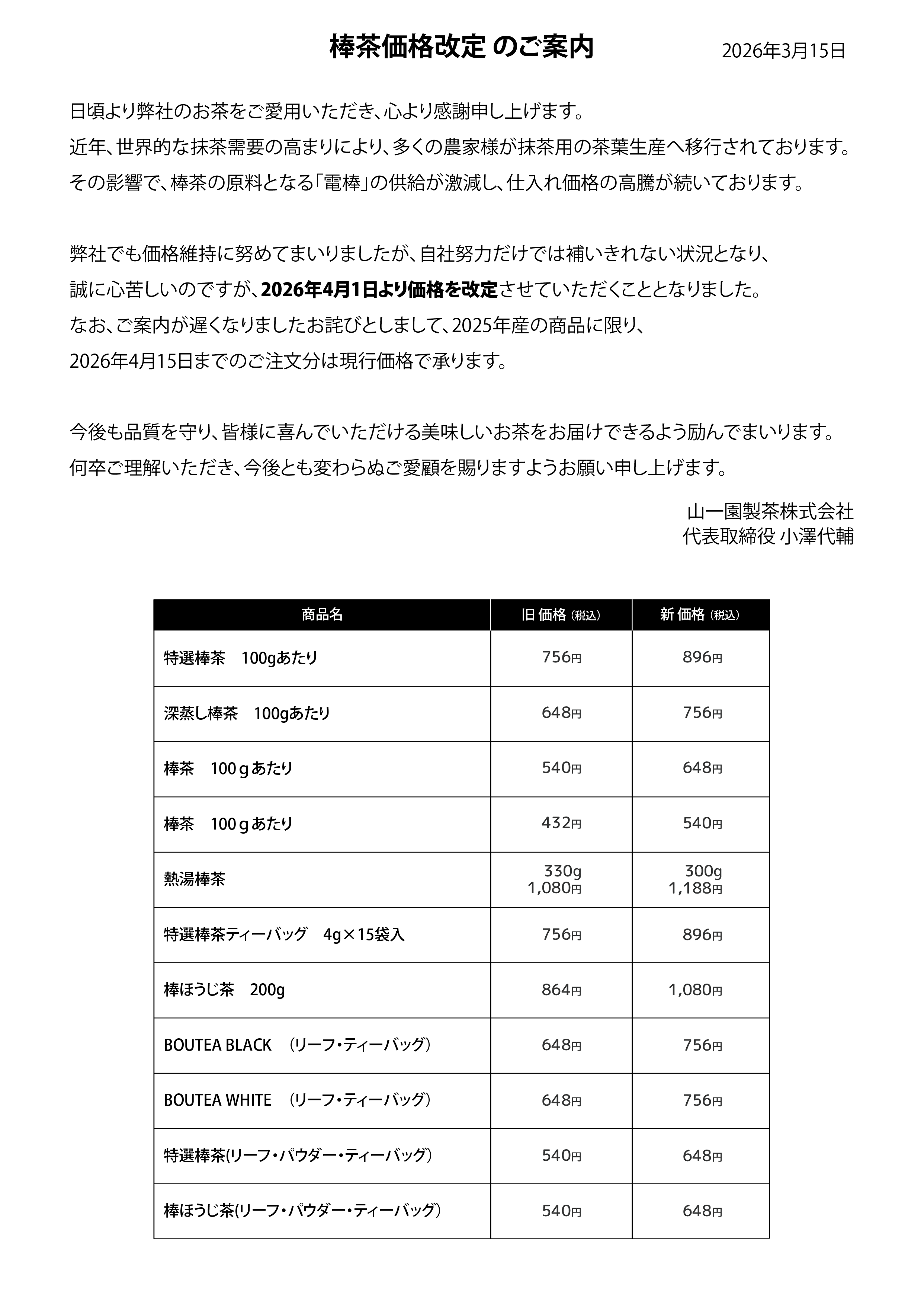 お茶商品の賞味期限は1年という期間が多い中、山一園製茶の商品は賞味期限が6ヶ月です。美味しい静岡茶をより美味しく、本来のお茶を飲んでいただきたい!そんな思いからつくり上げると、どうしても賞味期限が短くなってしまうのです。どこにでもあるお茶ではなく、山一園製茶しかないお茶を皆様にお届けしたいと思っております。